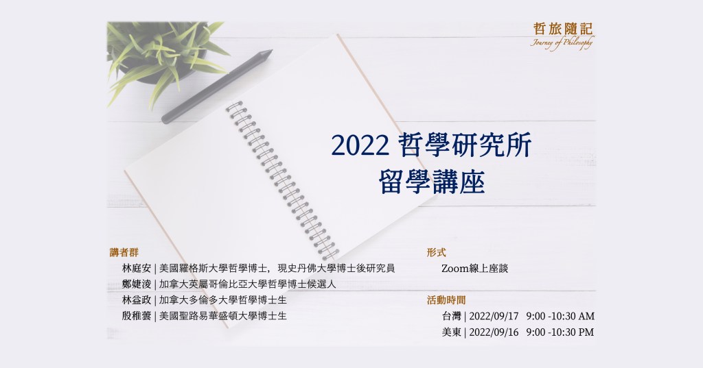 你對出國念哲學研究所有興趣嗎?想知道在國外攻讀哲學研究所的生活是怎麼一回事?修讀的過程有什麼收穫、心得、與心酸?那你不能錯過哲旅隨記舉辦的「2022哲學研究所留學講座」。